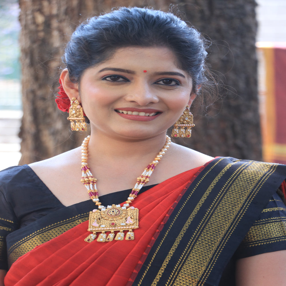 Long Necklace Set with Moti Mala and Wine Color Stones